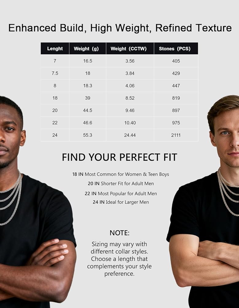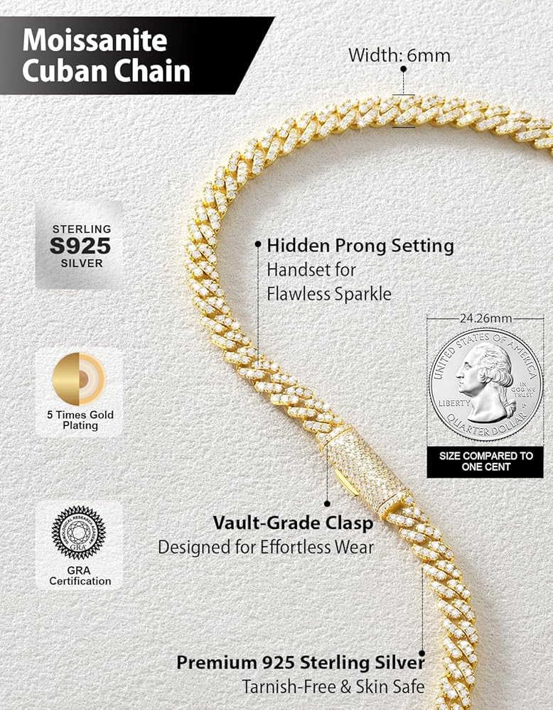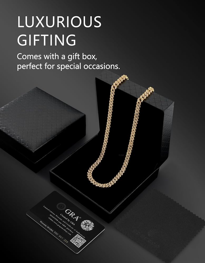 - Hidden Prongs & No Gaps: Every moissanite is hand-set in a reinforced basket setting to maximize security. Advanced nano-plating and high-polish techniques offer enhanced resistance to scratches, tarnish, and oxidation. Anti-flip cuban design avoid twists and tangles. A staple of hip-hop elegance, this moissanite chain helps you express confidence, independence, and passion.
