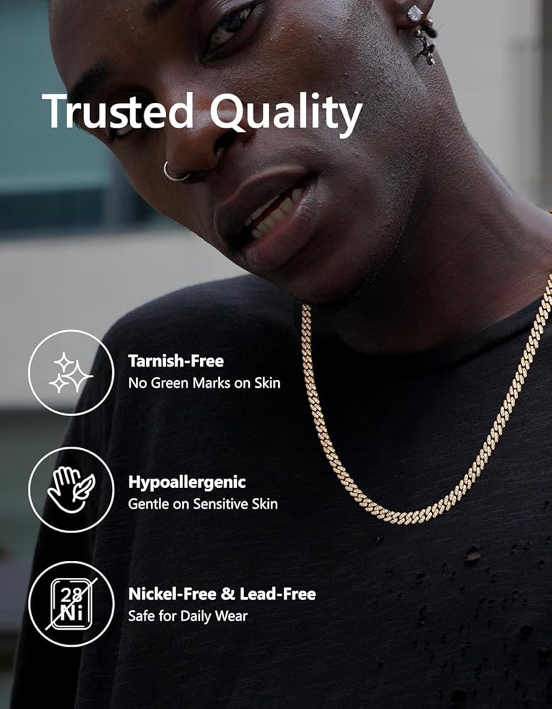 - Hypoallergenic & Vault-Grade Clasp Security: Crafted with nickel-free and lead-free 5-layer 14k gold plating over sterling silver, this mens cuban link chain is hypoallergenic and ideal for sensitive skin. It wonโt irritate or discolor your skin. The secure box clasp ensures easy wear and reliable closure. Perfect for all occasionsโwhether dancing, working out, or partyingโyou can wear it with confidence.